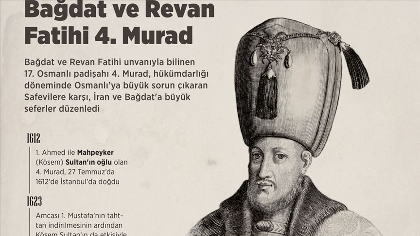AA muhabirinin kaynaklardan derlediği bilgilere göre, 1. Ahmed ile Mahpeyker (Kösem) Sultan'ın oğlu olarak 27 Temmuz 1612'de İstanbul'da doğan 4. Murad, amcası 1. Mustafa'nın akli dengesinin yerinde olmadığı gerekçesiyle Sadrazam Kemankeş Ali Paşa ve Şeyhülislam Yahya Efendi ile devletin ileri gelenleri tarafından tahttan indirilmesinin ardından 10 Eylül 1623'te tahta çıktı.