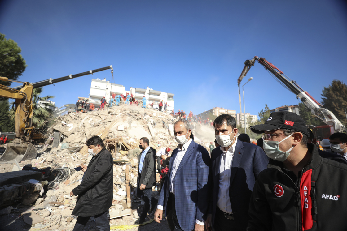 Çevre ve Şehircilik Bakanı Murat Kurum ile Adalet Bakanı Abdulhamit Gül, İzmir'in Bayraklı ilçesinde depremden etkilenen Emrah ve Rızabey apartmanlarının enkazlarında yürütülen arama kurtarma çalışmalarını inceledi.
