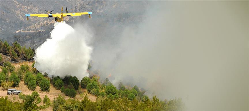 Arazinin engebeli olması nedeniyle müdahalede zorlanan ekipler, karadan arazözler, havadan uçak ve helikopterlerle alevleri kontrol altına almaya çalışıyor. Çevre belediyelere ait araçlarla da yangın bölgesindeki tanker ve arazözlere, su ile yakıt ikmalinde bulunuluyor.
