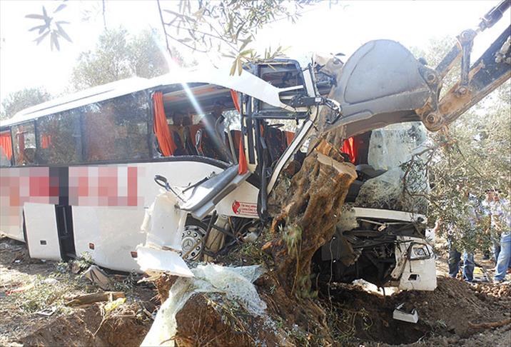 Yaklaşık 5 metre yükseklikten zeytin ağaçlarına çarparak şarampole uçan otobüs; önüne çıkan zeytin ağaçlarını devirdi, 30 metre sürüklendikten sonra ön tekerleklerinin kopmasıyla ancak durabildi.