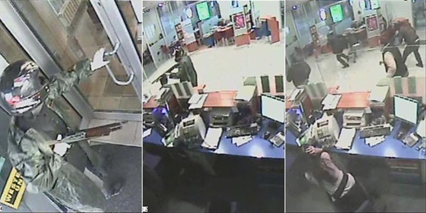 İl Emniyet Müdürlüğünün basına dağıttığı görüntülerde, banka şubesine başında kask ve elinde pompalı tüfekle giren zanlı İbrahim A'nın (44), müşterileri ve çalışanları iç kısma doğru gitmeleri konusunda uyardığı görülüyor. Uyarısını kimsenin dikkate almaması üzerinde zanlı, yanındaki pompalı tüfekle karşı tarafa doğru bir al ateş ederek numaratörü vuruyor.