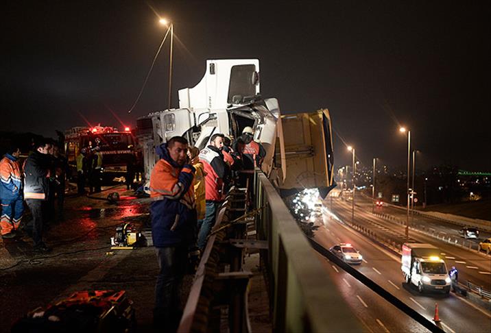 Üsküdar'da devrilerek bariyerde asılı kalan kamyonun sürücüsü, itfaiye ekiplerinin yaklaşık 2,5 saat süren çalışması sonucu sıkıştığı yerden kurtarıldı.