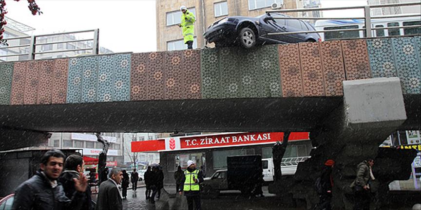 Otomobil köprüde asılı kaldı, parçalanan bariyerin bir bölümü, köprüden düştü. Kazada, otomobilin sürücüsüyle başına bariyerden düşen bir parça isabet eden Satı Ülke yaralandı.