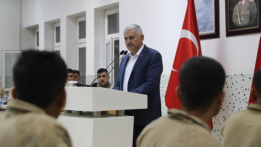 Bu anlayışla yalnızca yurt içinde değil, yurt dışında da hareket ettiklerini vurgulayan Yıldırım, "Hamdolsun 250 kilometrelik Suriye batı sınırındaki bölgeyi tamamen terörden temizledik. Yani Fırat'ın batısında artık ülkemizi rahatsız edecek bir terör unsuru kalmadı ama Doğu'da yapılanma devam ediyor. Şunu dost ve düşman herkesin bilmesini istiyorum; milletimizin güvenliği konu olunca, milletimizin huzuru mevzubahis olunca, topraklarımızın bütünlüğü mevzu bahis olunca bizim için Fırat'ın doğusu olmuş, batısı olmuş hiç fark etmez. Terör neredeyse gideriz, yerinde yok ederiz. Bu kadar açık ve net söylüyorum." ifadesini kullandı.