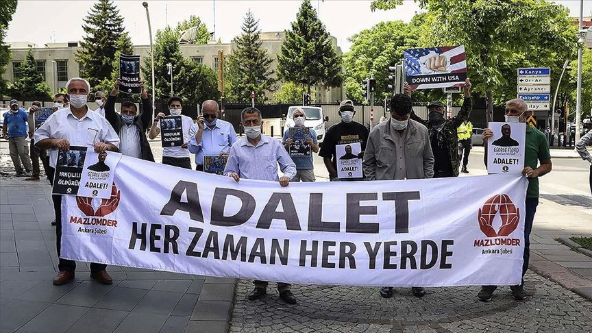 MAZLUMDER Ankara Şubesi öncülüğünde bazı sivil toplum kuruluşları (STK) tarafından ABD'nin Ankara Büyükelçiliği önünde düzenlenen eylemde protestocular, "Irkçılık öldürür", "Nefes alamıyoruz" yazılı ve Floyd'un fotoğraflarının yer aldığı dövizler taşıdı.