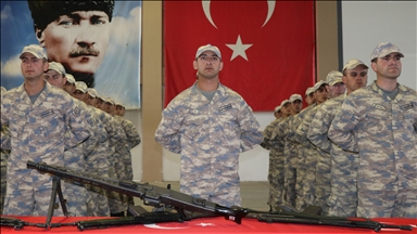 Silahlar ve Türk bayraklarının bulunduğu masaların etrafında sıralanan askerler, Türk bayrağı ile silah üzerine el basarak yemin etti.