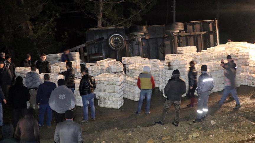 Kazada yaralanan olmazken, kamyonda yüklü canlı tavuklar yola saçıldı.