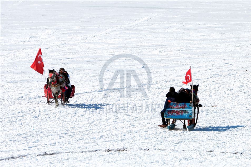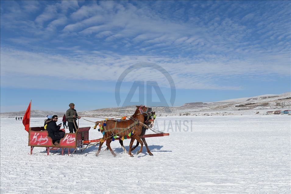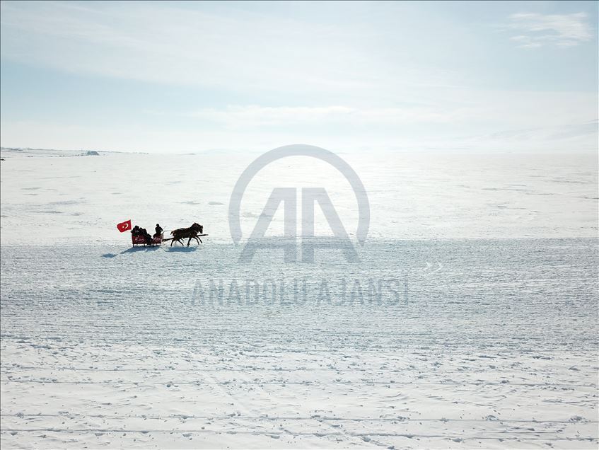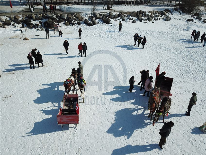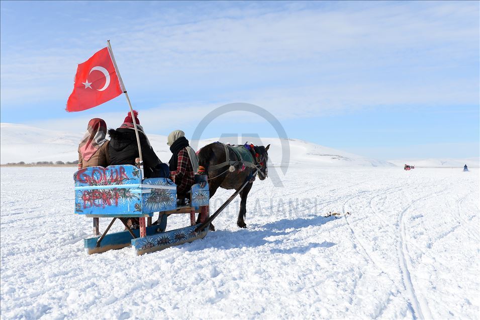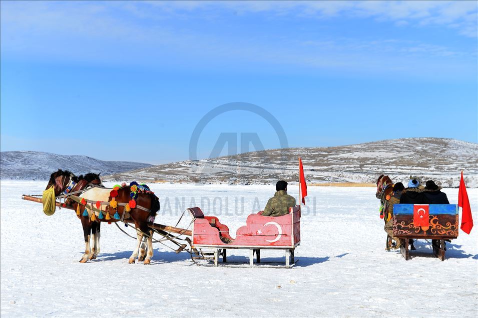 Kars-Ardahan sınırında bulunan ve kış aylarında yüzeyi tamamen buzla kaplanan Çıldır Gölü, yerli ve yabancı turistlerin beğenisini topluyor.