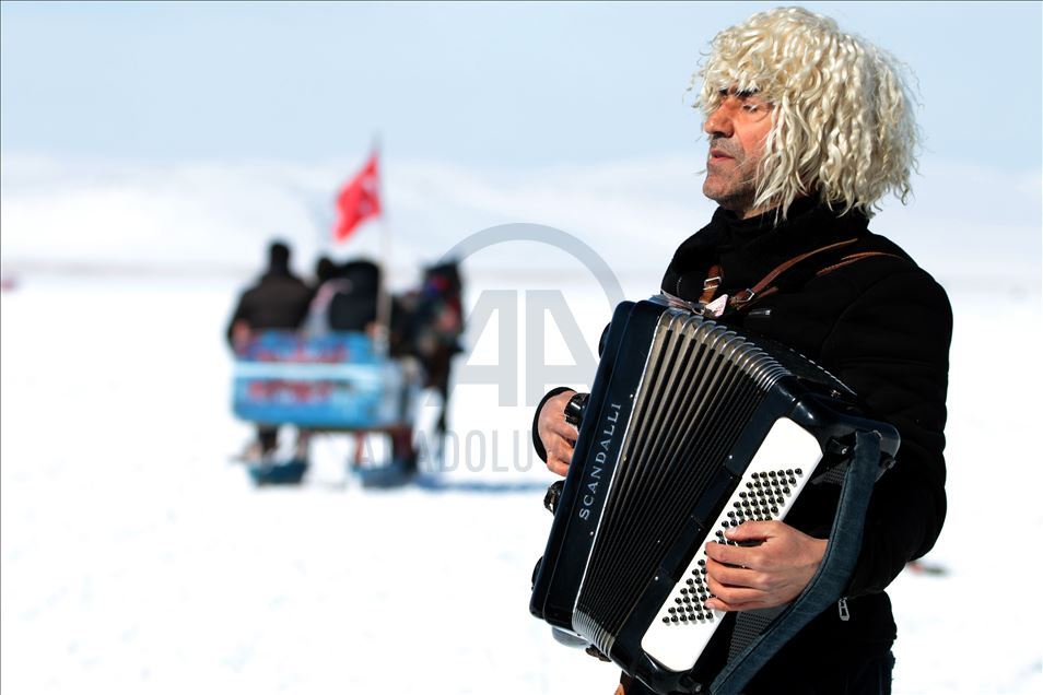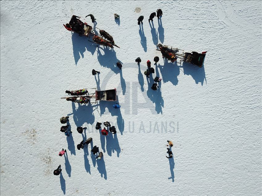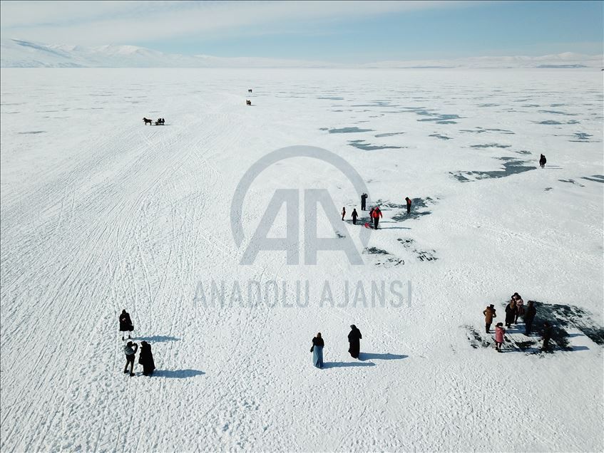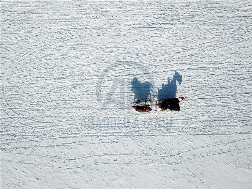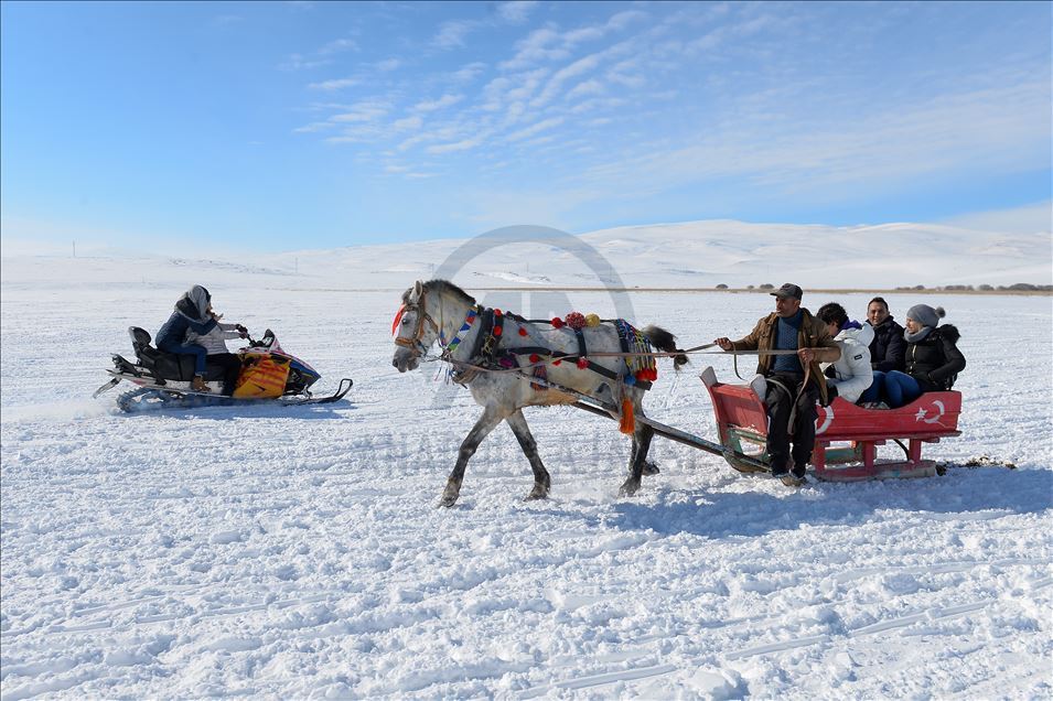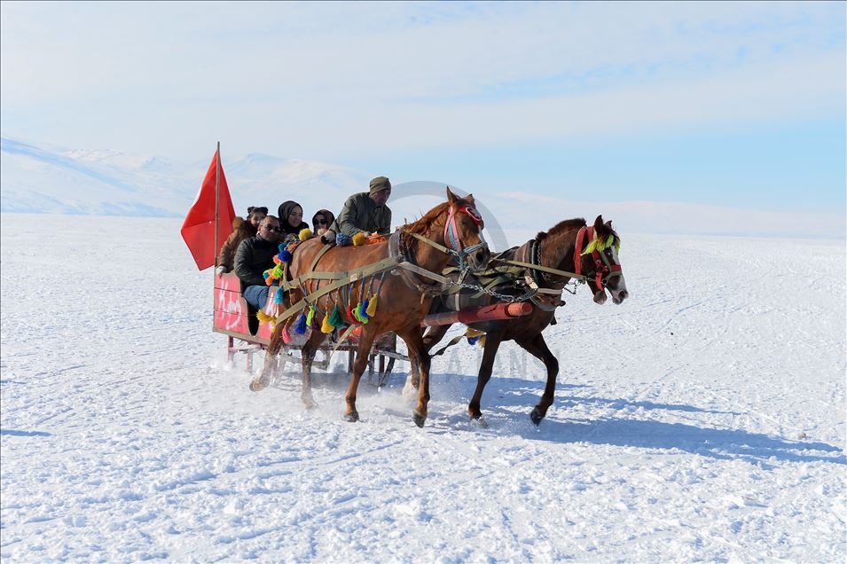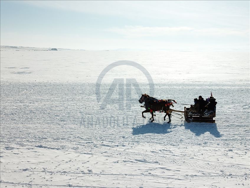 Kars-Ardahan sınırında bulunan ve kış aylarında yüzeyi tamamen buzla kaplanan Çıldır Gölü, yerli ve yabancı turistlerin beğenisini topluyor.