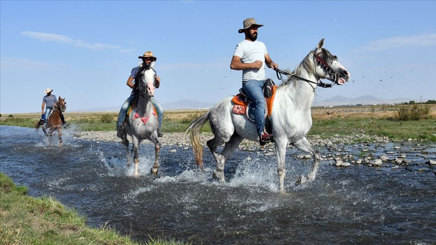 Hava sıcaklığının 30-35 derecelere yükseldiği Selim ilçesine bağlı Kekeç köyündeki cirit tutkunları, atlarını sıcak havalarda köy yakınındaki dereye her gün 3'erli gruplar halinde getiriyor.