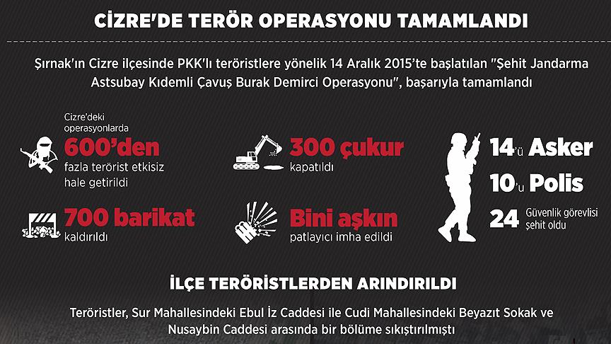 Kırsaldaki saldırılarını şehirlere taşıyan PKK'lı teröristlere yönelik Şırnak'ın Silopi ve Cizre ilçelerinde 14 Aralık 2015'te ilan edilen sokağa çıkma yasağının ardından başlatılan ve 2. Ordu Komutanı Orgeneral Adem Huduti tarafından yönetilen operasyonların 59. gününde, Cizre teröristlerden temizlendi.