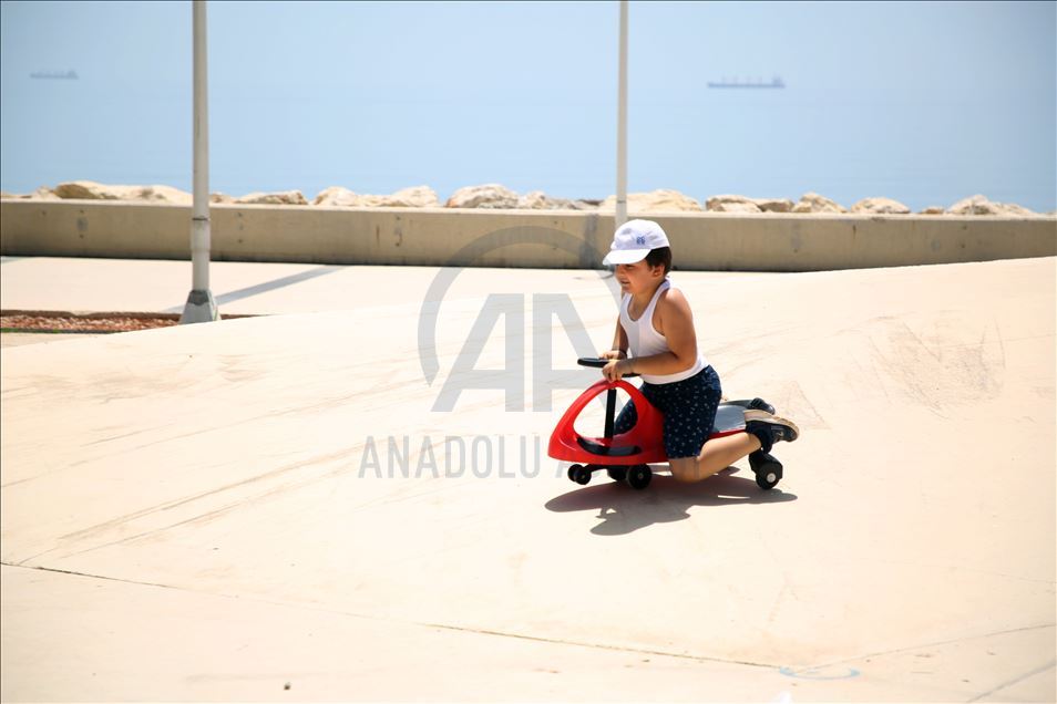 Sahil bandına aileleriyle gelen çocuklar, buradaki parklarda oynadı, sıcak havanın keyfini çıkardı.