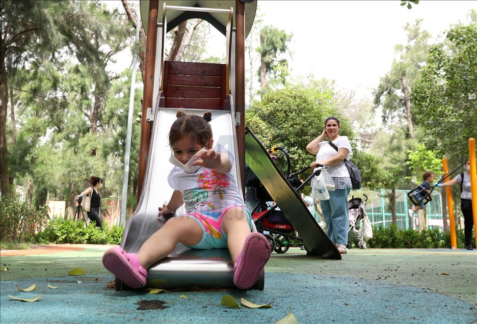 Adana'da, Atatürk Parkı'na aileleriyle saat 11.00'den itibaren gelen çocuklar, maske takıp sosyal mesafeye uygun şekilde oyunlar oynadı.