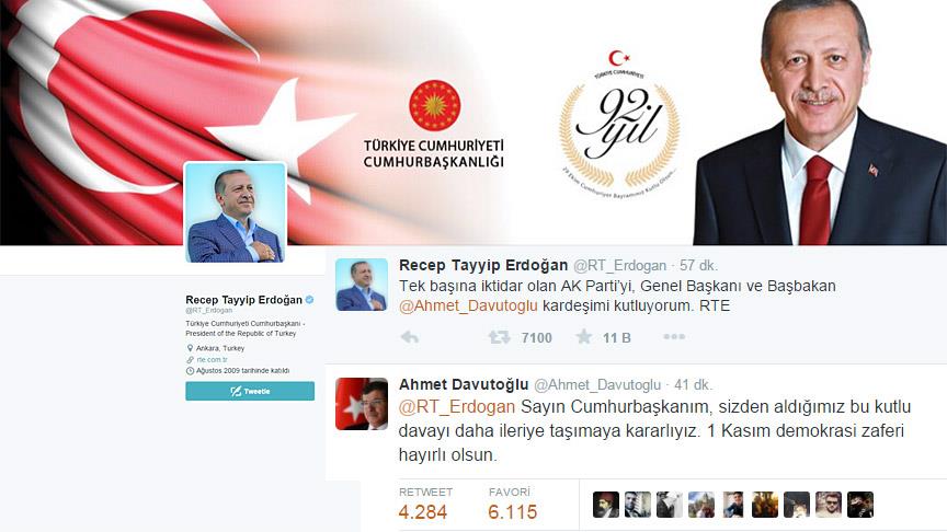 Cumhurbaşkanı Erdoğan'ın, Twitter'daki kullanıcı adını ekleyerek mesaj gönderdiği Başbakan Davutoğlu da cevap olarak, "Sayın Cumhurbaşkanı, sizden aldığımız bu kutlu davayı daha ileriye taşımaya kararlıyız. 1 Kasım demokrasi zaferi hayırlı olsun" mesajını paylaştı.
