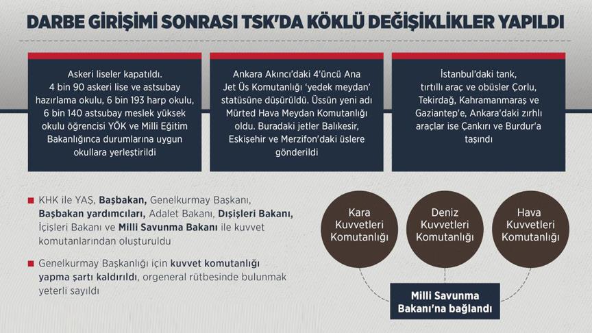 Fetullahçı Terör Örgütü'nün (FETÖ) darbe girişiminin ardından Yüksek Askeri Şuranın yapısından, Türk Silahlı Kuvvetlerine personel alımına, milli savunma bakanı ve genelkurmay başkanının yetkilerinden askeri okulların durumuna kadar birçok alanda önemli yapısal değişiklikler yapıldı. Tanklar şehir merkezlerinden çıkarıldı, 15 Temmuz'da darbeciler tarafından üs olarak kullanılan Akıncı'daki komutanlığın statüsü "yedek meydan"a düşürüldü.