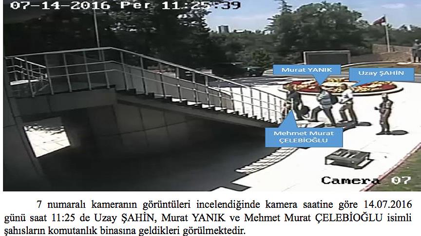 İddianamede, bir gün öncesinden gerçekleştirilen toplantılarla darbe teşebbüsüne hazırlık yaptıkları görülen şüphelilerin, 15 Temmuz'daki hareketlilikleriyle ilgili de kamera görüntüsü analizine yer verildi.