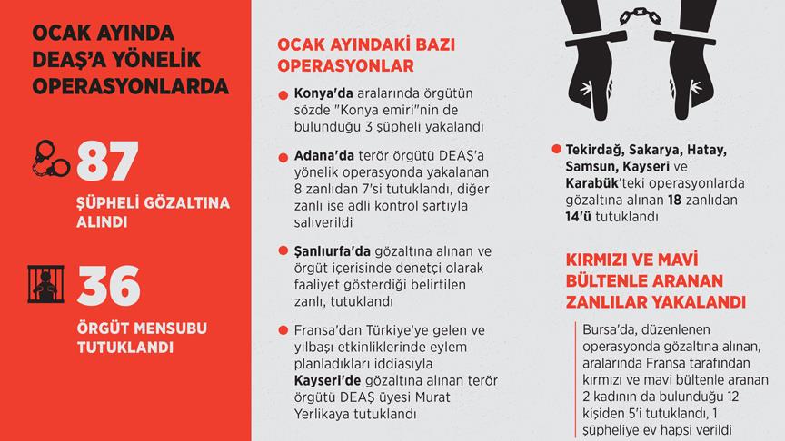 AA muhabirinin derlediği bilgilere göre, polis, jandarma ve hudut birliklerinin ocak ayında yürüttüğü çalışmalarda, aralarında örgütün sözde sorumluları olduğu belirlenen yabancı uyrukluların da bulunduğu 87 şüpheli gözaltına alındı. Zanlıların adreslerindeki aramalarda çok sayıda örgütsel doküman ve dijital malzeme ele geçirildi.