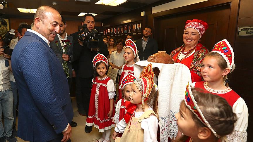 Ardından Alanya Ticaret ve Sanayi Odasına gelen Çavuşoğlu, ilçede ikamet eden Ruslarla bir araya geldi. Yöresel kıyafetli Rus çocukları, Bakan Çavuşoğlu'nu tam buğdaydan yapılan ve Rusya'da özel konukların karşılandığı "Karavay" ekmeğiyle karşıladı. Rusça selam vererek, sohbet eden Çavuşoğlu, tuzlu ekmekten tadarak, fotoğraf çektirdi.