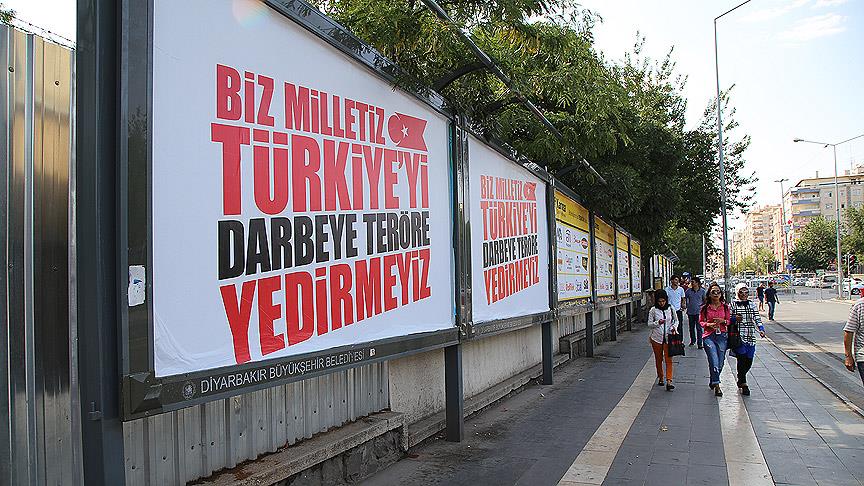 Fetullahçı Terör Örgütü'nün (FETÖ) darbe girişimi ile terör örgütü PKK'nın saldırılarına tepki cadde ve sokaklardaki billboardlara asılan, "Biz milletiz Türkiye'yi darbeye teröre yedirmeyiz" yazılı afiş Diyarbakır'da memnuniyetle karşılandı.