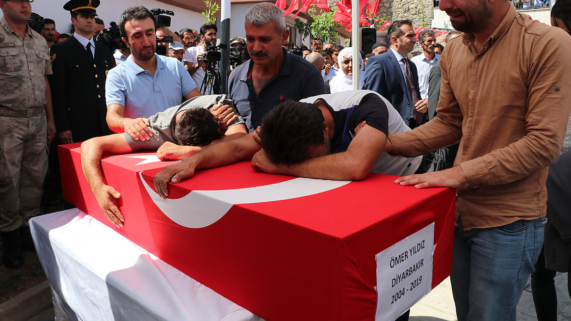 Diyarbakır'ın Kulp ilçesi kırsalında odun toplamaya giden sivillerin bulunduğu araca PKK'lı teröristlerce düzenlenen saldırıda şehit düşen 7 kişiden Ömer (15), Abit (22), Siraç Yıldız (26) ile Ahmet Ay'ın (23) cenazesi düzenlenen törenle son yolculuğuna uğurlandı.