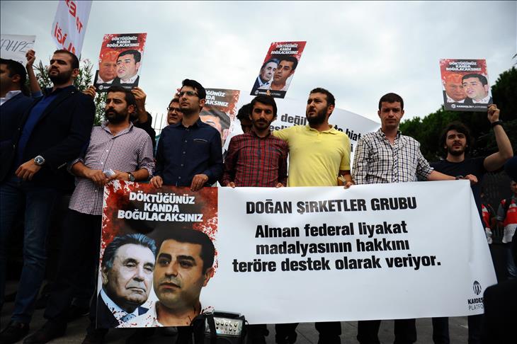 Grup üyeleri açıklamanın ardından holding binasının önüne üzerinde, "Teröre verdiği destekten dolayı Doğan Medyası'nı kınıyoruz" yazılı siyah çelenk bıraktı.