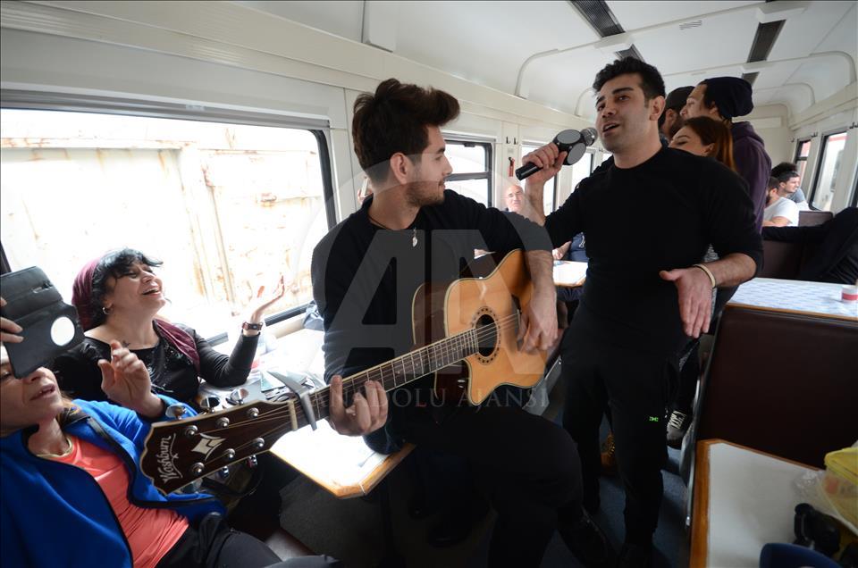 Kompartımandaki pencereleri rengarenk led ışıklarla aydınlatan yolcular, seferlerine ayrı bir keyif katıyor. Yerli ve yabancı turistlerin bulunduğu trende yolculuk, şarkı ve türkülerle unutulmaz hale geliyor.
