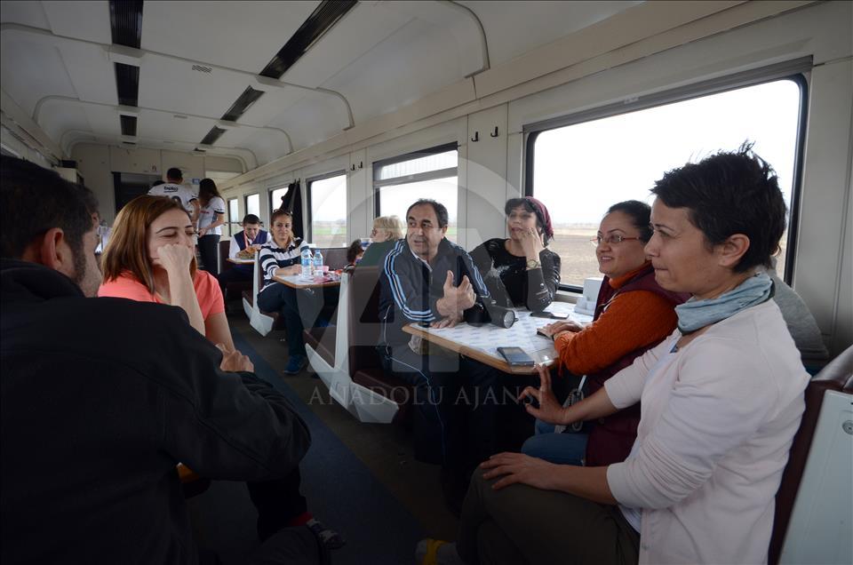 Doğu Ekspresi ile seyahat eden her yaştan yolcular, yanlarında getirdikleri yiyecekleri birbirleriyle paylaşıyor, düzenledikleri etkinliklerle eğlencenin tadını çıkarıyor.