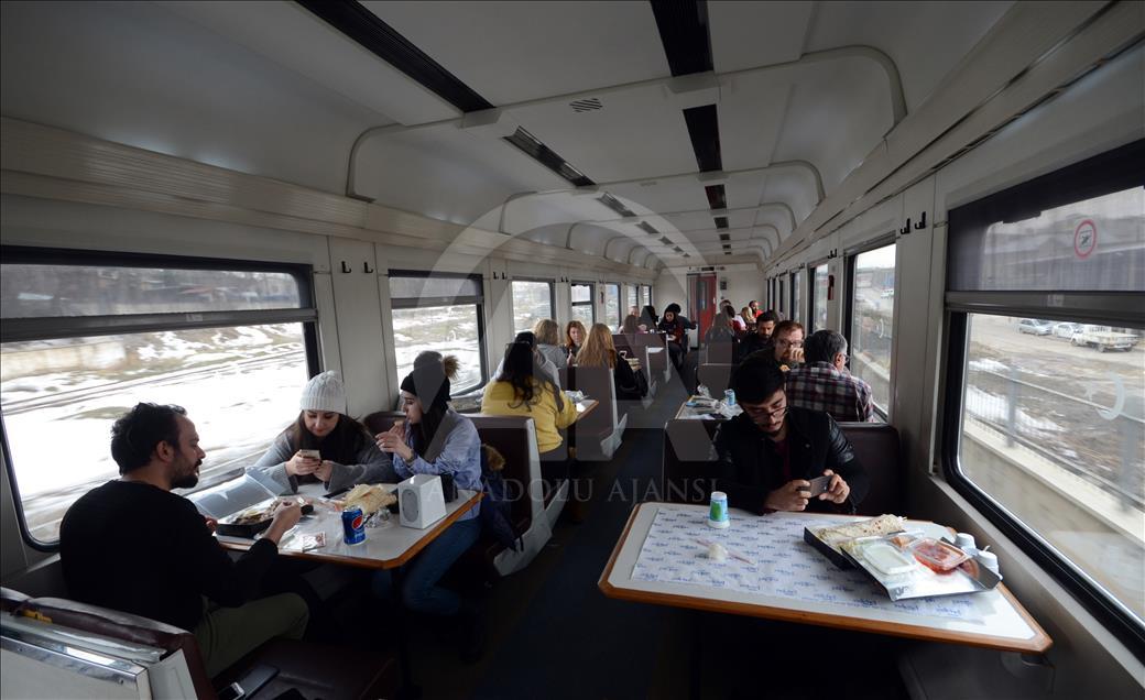 Türkiye Cumhuriyeti Devlet Demiryolları (TCDD) Taşımacılık AŞ'nin en uzun rotalarından Ankara-Kars arasında Doğu Ekspresi ile 25 saat yolculuk yapanlar, unutulmaz ve keyifli anlar yaşıyor. TCDD Taşımacılık AŞ'nin Doğu Ekspresi treni, yolcuların yoğun ilgisiyle seferlerini sürdürüyor. Ankara'dan başlayıp Kars'ta son bulan Türkiye'nin en eski hatlarından Doğu Ekspresi ile yolculuk 25 saatte tamamlanıyor. ( Hüseyin Demirci - Anadolu Ajansı )