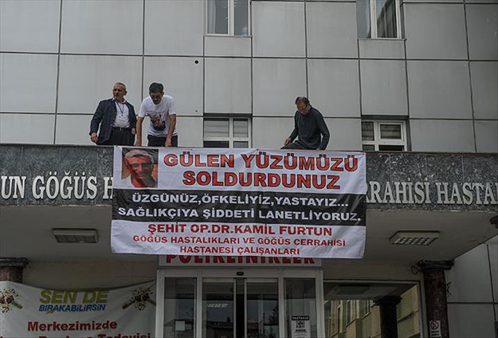 Göğüs Hastalıkları ve Göğüs Cerrahisi Hastanesinde görev yapan sağlık çalışanları, Opr. Dr. Furtun için hastane önüne, "Gülen Yüzümüzü Soldurdunuz", "Üzgünüz, Öfkeliyiz, Yastayız" ve "Sağlıkçıya Şiddeti Kınıyoruz" yazılı pankartlar astı.