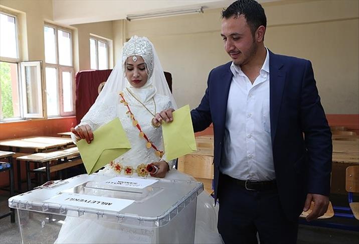 Gelin Şenol, AA muhabirine yaptığı açıklamada, düğünü böyle bir tarihe geldiği için çok mutlu olduğunu belirterek, "Düğünümüz bugüne denk geldi. Oyumuzu kullandık, buradan salona gidiyoruz. Gelinliğimle oy kullandım, mutluyum" dedi.
