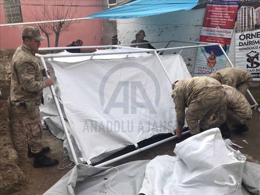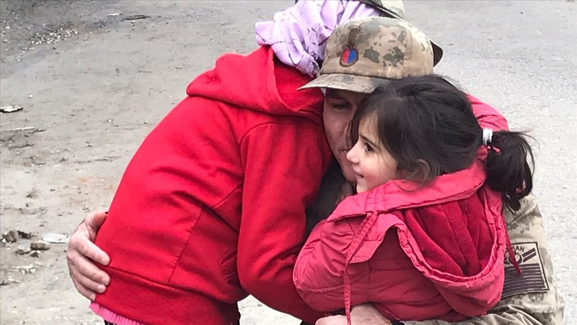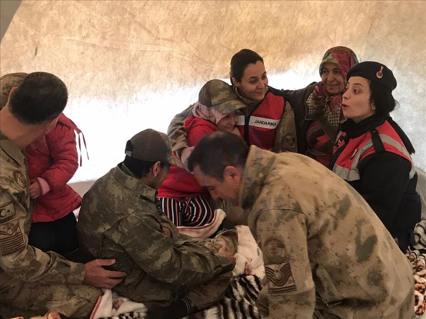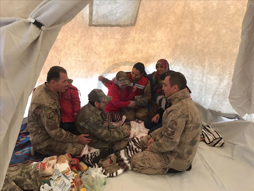 Elazığ'da, engelli çocuğu da bulunan 8 kişilik depremzede ailenin yüzü jandarmanın desteğiyle güldü. Aksaray Mahallesi'nde yaşayan Tekocak ailesine ait tek katlı evin depremde çöktüğünü öğrenen jandarma, aileye sürpriz yaptı. Getirdikleri çadırı evin bahçesine kuran Mehmetçik, içerisine ihtiyaç ve gıda malzemeleri yerleştirdi.Ailenin, arasında engelli Samet'in de yer aldığı çocuklarına yönelik etkinlik düzenleyen ekipler, deprem travmasından uzaklaşmalarına katkıda bulundu. ( Elazığ İl Jandarma Komutanlığı - Anadolu Ajansı )