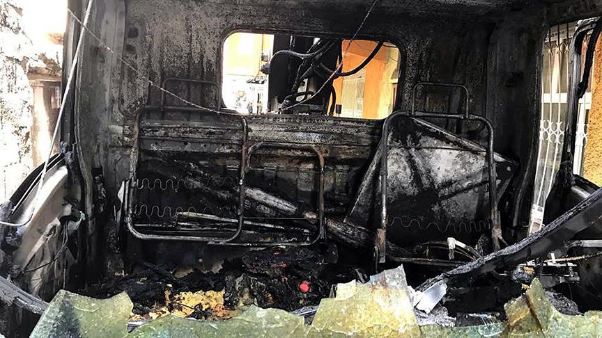 Araçta bulunan 3 çalışanı aşağıya indiren söz konusu kişiler, hakaret ettikten sonra benzin dökerek aracı ateşe verdi.
