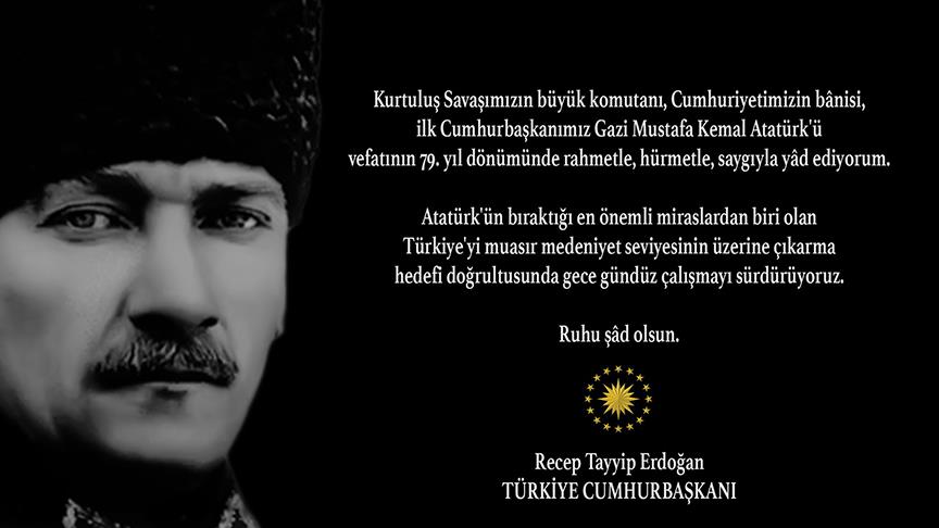 Kurtuluş Savaşı'nın büyük komutanı, Cumhuriyetin banisi, ilk Cumhurbaşkanı Gazi Mustafa Kemal Atatürk'ü vefatının 79. yıl dönümünde rahmetle, hürmetle, saygıyla yad ettiğini belirten Erdoğan, "Atatürk'ün bıraktığı en önemli miraslardan biri olan Türkiye'yi muasır medeniyet seviyesinin üzerine çıkarma hedefi doğrultusunda gece gündüz çalışmayı sürdürüyoruz." ifadesini kullandı.