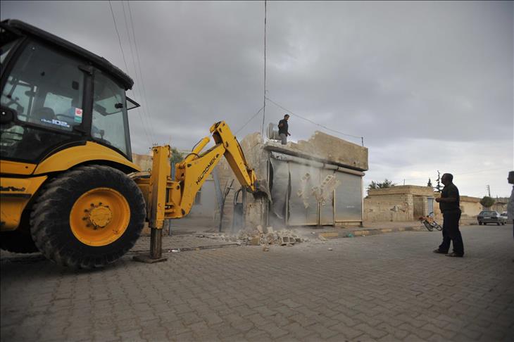Suriye'nin Tel Abyad ilçesinden 3 gün önce atılan top mermisinin isabet ettiği Yeni Mahalle'de bulunan Ömer Timuçin'e ait eve gelen belediye ekipleri, iş makineleriyle bahçe duvarını yıktı.
