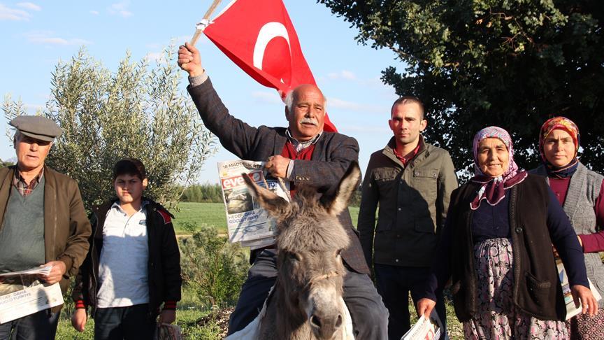 Gebiz Mahallesi'nde yaşayan 59 yaşındaki Şimşek, 16 Nisan'da yapılacak halk oylaması çalışması kapsamında eşeğiyle yola çıkıp, sokak sokak dolaşıyor. "Reisimiz için, geleceğimiz için, çocuklarımız için, vatan için, millet için, bayrak için 'evet' diyoruz" diye bağıran Şimşek, eşek üstünde vatandaşlara broşür dağıtıyor.