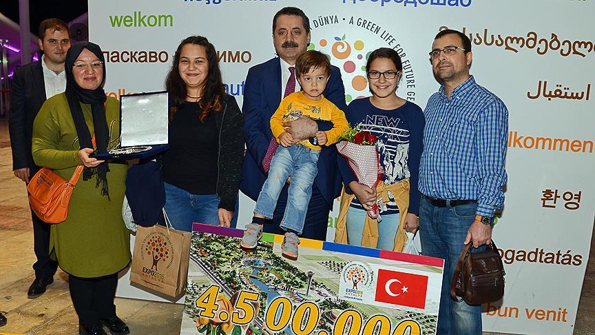 Antalya'daki temaslarını sürdüren Çelik, sergi alanındaki ana giriş kapısında, EXPO 2016 Antalya'yı ziyaret eden 4 milyon 500 bininci kişi olan Bıyıklıoğlu ailesini karşıladı.