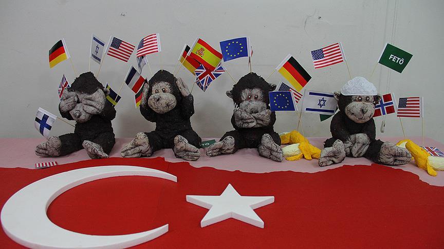 Adana'da Heykeltraş Bülent Harputlu, darbe girişiminin ardından kendi atölyesinde üç haftalık çalışmayla peluş ve alçıyla hazırladığı dört maymunu, ortasında ay-yıldızın yer aldığı Türkiye haritasının çevresine yerleştirerek sergisini tamamladı. Çeşitli ülkelerin bayraklarının da yer aldığı sergide, FETÖ elebaşı Fetullah Gülen, başında takke bulunan ve ellerini bacaklarının arasına almış şekilde tasvir edildi.