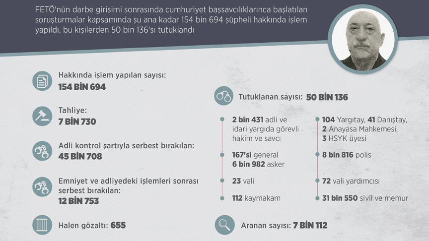 FETÖ'ye ilişkin soruşturmalar kapsamında 211 hakim ve savcı, altı Danıştay üyesi, 25 Yargıtay üyesi, 137 asker, 369 polis, üç vali yardımcısı, sekiz kaymakam, 6 bin 353 kamu görevlisi ve sivil olmak üzere 7 bin 112 şüpheli hakkında yakalama kararı bulunuyor.