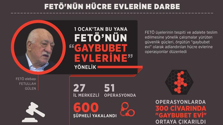 Fetullahçı Terör Örgütü/Paralel Devlet Yapılanması'nın (FETÖ/PDY) "gaybubet evi" olarak adlandırılan hücre evleri ile öğrenci evlerine yönelik 1 Ocak'tan bu yana ülke genelinde gerçekleştirilen operasyonlarda aralarında "şike hakimi" ve firari eski "HSYK Genel Sekreteri"nin de bulunduğu 600 şüpheli yakalandı.