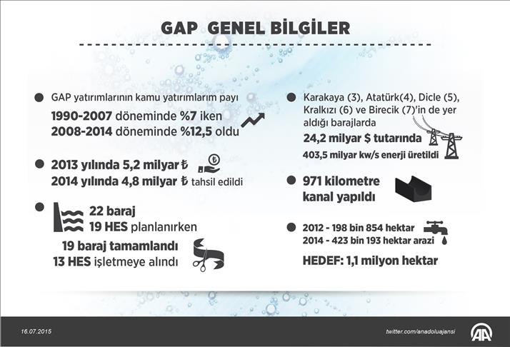 Dünyanın sayılı bölgesel kalkınma projelerinden GAP'ın tamamlanması için kamu yatırımlarından ayrılan pay son yıllarda artırılırken, 2008'de uygulanmaya başlanan GAP Eylem Planı ile bölgenin ekonomik ve sosyal göstergelerinde kısa sürede önemli iyileşmeler sağlandı.