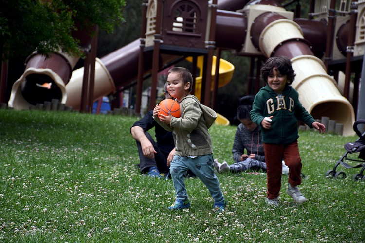 Ailelerinin Maçka Demokrasi Parkı'na getirdiği çocuklar çimenlerde oturdu, oyuncaklarıyla oynadı. Sosyal mesafe kuralına uyan aileler, çocukların parkta eğlendiği anları cep telefonuyla da kaydetti.