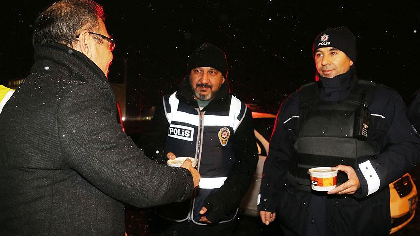 Nevşehir Valiliğince düzenlenen etkinlikte, valilik personelieri kar yağışı altında kentin çeşitli noktalarında uygulama yapan polis ve jandarma ekiplerini ziyaret ederek, sıcak çorba ikramında bulundu.