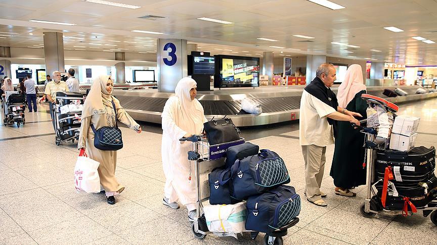 Suudi Arabistan'ın Medine ve Cidde kentlerinden kafileler halinde İstanbul'a ulaşan hacılar, pasaport kontrolünün ardından beraberinde getirdiklerini zemzem ile hurmalarını teslim aldı.