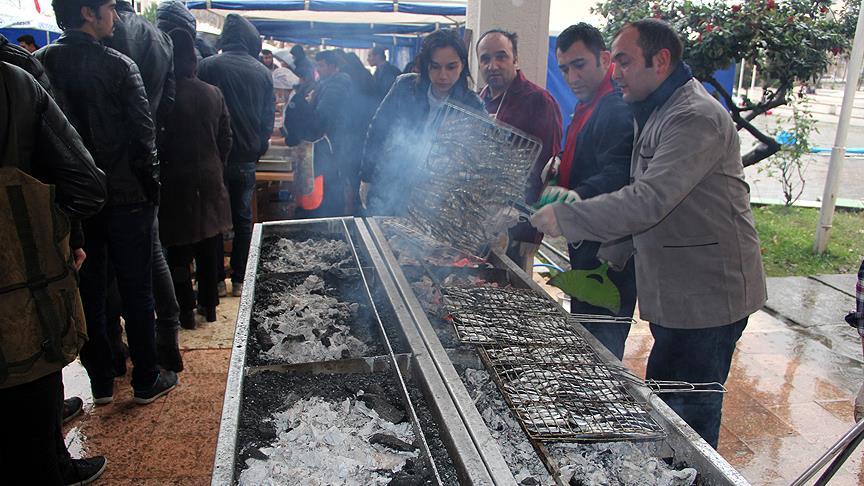 Şenlikte davetliler, görevliler ile öğrenciler, yaklaşık 500 kilogram ızgara hamsi ile yanında verilen ekmek, soğan ve helva yedi.