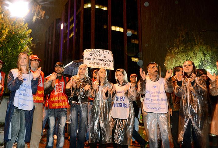 Türk Hava Yolları (THY) yönetim binası önünde toplanan sendika üyeleri, ''THY'de grev var" yazılı pankartı binanın girişine astı.