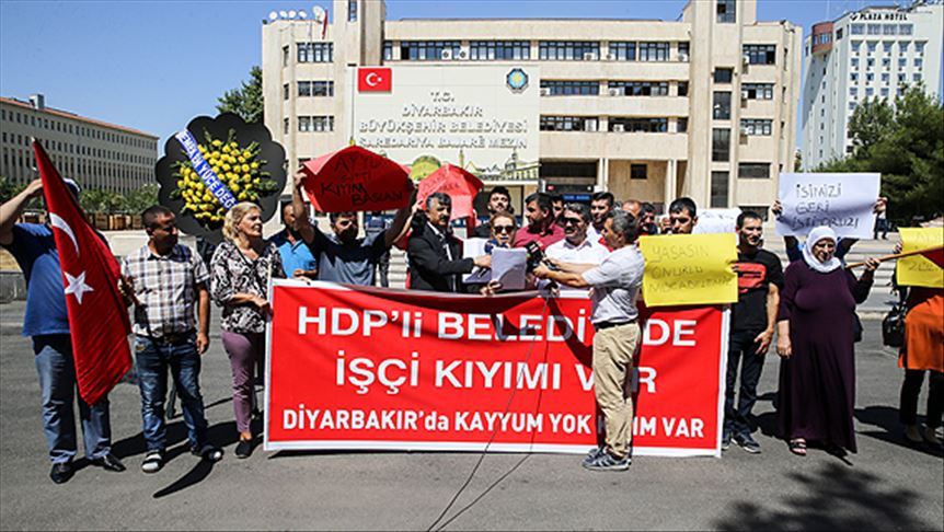 Diyarbakır Büyükşehir Belediyesi önünde bir araya gelen işten çıkarılanlar ile yakınları, "HDP'li belediyede işçi kıyımı var", "Diyarbakır'da kayyum yok kıyım var", "İşimizi geri versinler bu vebalden kurtulsunlar", "Kayyum gitti yıkım başladı", "Alın teri dökene zulüm etmeyiniz" ve "İşimizi geri istiyoruz" pankartları taşıdı.