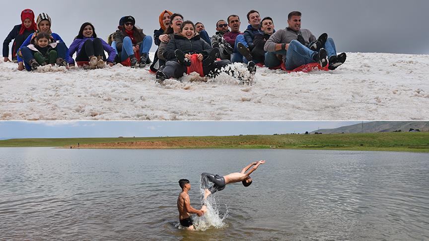 Çocuklardan Muhammed Aykut, gölette yüzerek eğlendiklerini belirterek, "Mayıs ayındayız dağlarda kar var. Ovada ise hava sıcak. Hayvanlarımız otlanırken biz de yüzerek serinliyoruz. Biz denizi sadece filmlerde görüyoruz, denizi görmeyi çok istiyoruz." dedi.