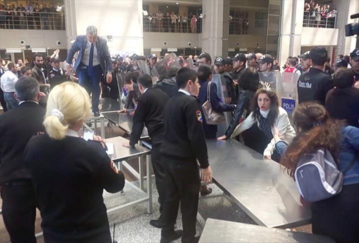 Polis ekipleri, uyarıyı dikkate almayan avukatları, kalkanlarla iterek binadan çıkardı. Bu sırada polis ile avukatlar arasında arbede yaşandı.
