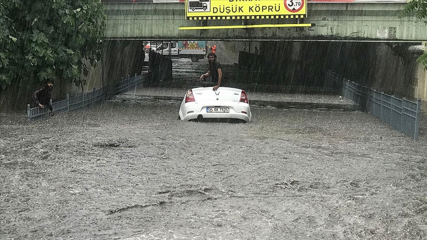 İstanbul Bayrampaşa'da etkili olan sağanak yağış nedeniyle oluşan taşkında bir araç alt geçitte mahsur kaldı. ( Taha Erham Keleş - Anadolu Ajansı )