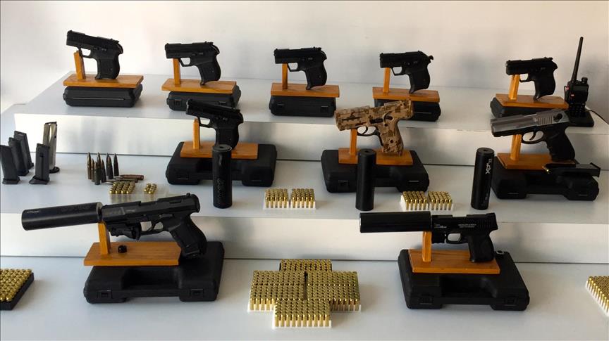 Zanlının evinde ve arabasında yapılan aramada, 10 tabanca, 5 susturucu, 2 tabanca lazeri, 642 mermi ve 1 polis kanalı yüklü telsiz ele geçirildi.